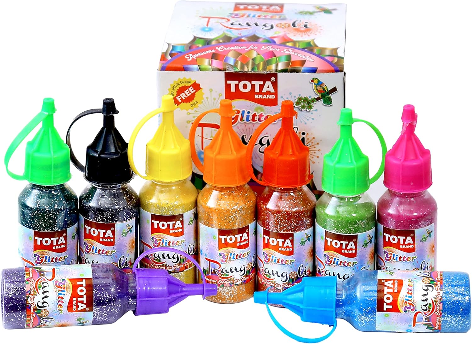 SPECIAL SPARKLE COLOURS – Red, Pink, Green, Yellow, Orange, Voilet, Light Green, Blue, Black. Each Flexible bottle has 80 gm of Glitter Powder Rangoli . Total 720gm of shiny rangoli powder colour set.